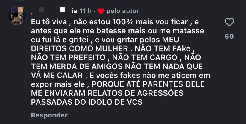 Em publicação nas redes sociais, a mulher afirmou que não será silenciada. “Não tem cargo que vai me calar. Eu tô viva, não estou 100%, mas vou ficar. E antes que ele me batesse mais ou me matasse, eu fui lá e gritei, e vou gritar pelos meus direitos como mulher. Não tem fake, não tem prefeito, não tem cargo, não tem amigos que vão me calar”, declarou.