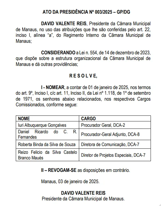 No mesmo Diário Oficial, a jornalista Roberta Bindá foi nomeada Diretora de Comunicação da CMM, também por indicação de David Reis. Roberta trabalhou na campanha de reeleição do prefeito David Almeida (Avante), em 2024, ao lado do ex-secretário municipal de Comunicação, Jack Serafim.