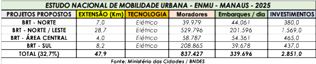 Na capital amazonense, os projetos previstos pelo estudo nacional são a implantação dos BRTs – Extremo Norte, Norte/Leste, Área Central e Extremo Sul.