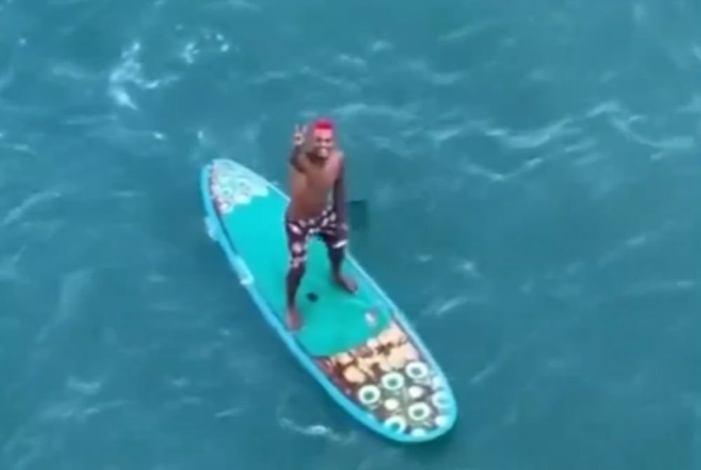 BÚZIOS (RJ) – O cruzeiro do jogador Neymar está rendendo assuntos e momentos inusitados na internet, dessa vez, um morador da cidade de Búzios, no litoral do Rio de Janeiro, Paulo Vitor, viralizou nas redes sociais, após ser gravado pelo influenciador Vinicius Barros, chegando do navio MSC Precioza em cima de uma prancha de stand up paddle. Fã de de Neymar, o jovem de 20anos aproveitou para ir ao local onde está ancorado o navio do atleta, e ganhou uma camiseta de presente.