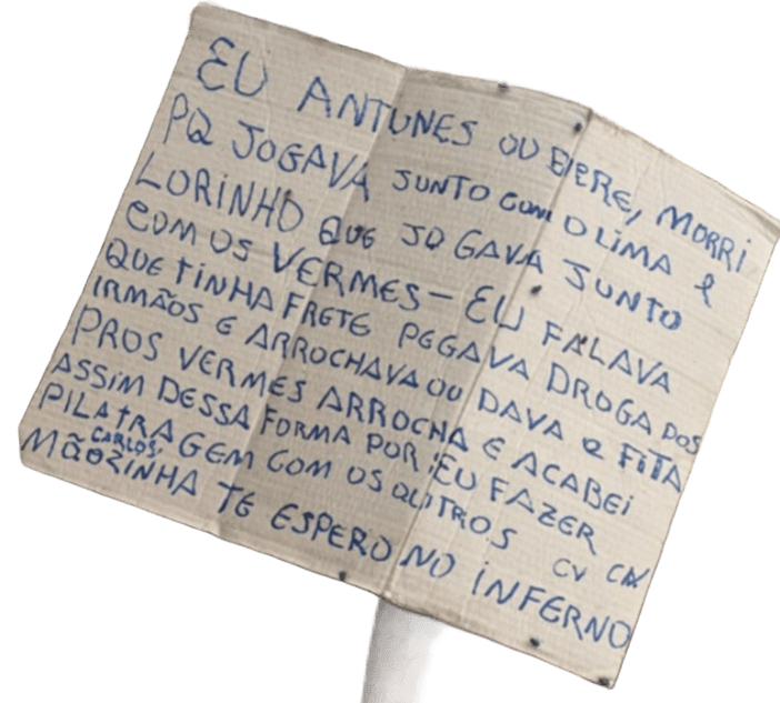 A mensagem dizia: “Eu, Antunes, morri porque jogava junto com os vermes, eu falava que tinha frete, pegava droga dos irmãos e arrochava ou dava a fita pros vermes e acabei assim dessa forma por eu fazer pilantragem com os outros”.