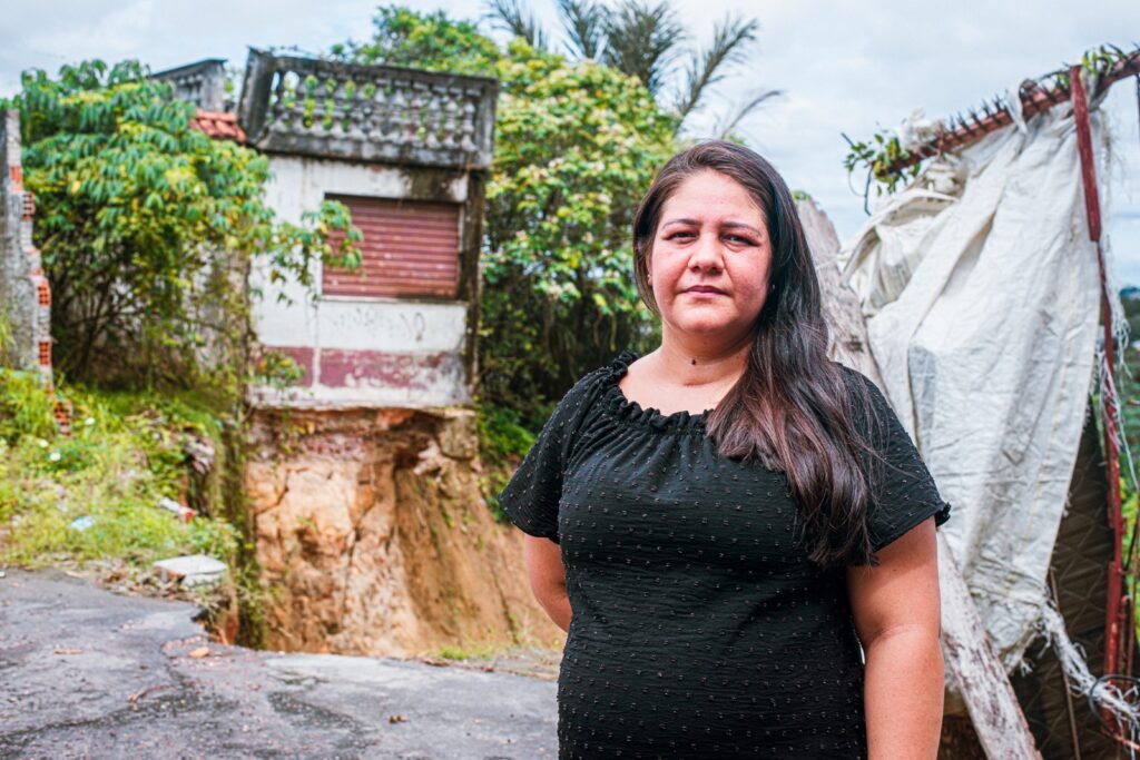 “A gente consegue ver aqui um precipício. Antigamente tinha um muro, mas esse muro também já estava condenado, prestes a cair. E aí, ontem [12/5] quando chegamos em casa, aconteceu essa situação [desabamento] e foi aquele desespero porque está bem na porta da minha casa. Eu tenho certeza que vai levar uma boa parte do meu terreno”, disse a moradora.