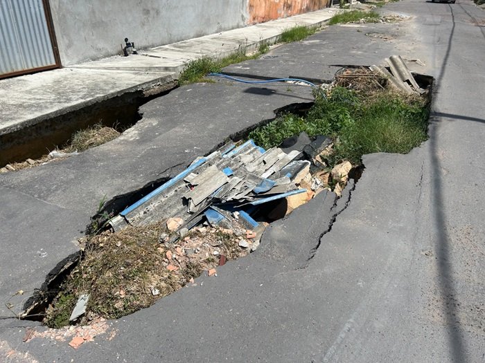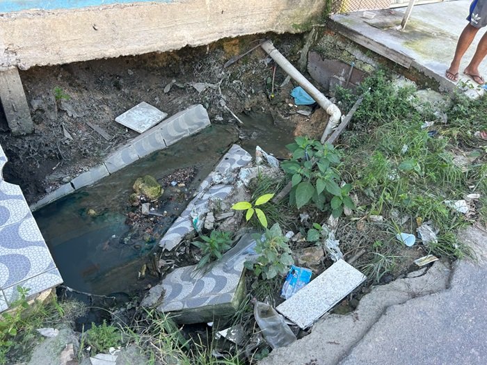 Daniel também relata o risco de acidentes durante os períodos de chuva. “O carro de uma mulher caiu aqui e teve que chamar o guincho. Quando chove, alaga tudo. A água leva sapatos, roupas e até ameaça a vida de crianças. Esse bueiro estourado é um perigo constante”, completou.