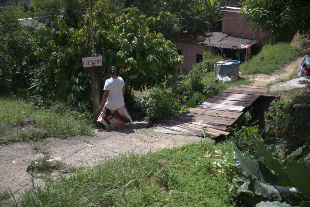 Diante da ausência de infraestrutura, os próprios moradores construíram uma ponte de madeira para auxiliar na locomoção e também improvisaram uma lixeira comunitária, mas ambos precisam de manutenção.