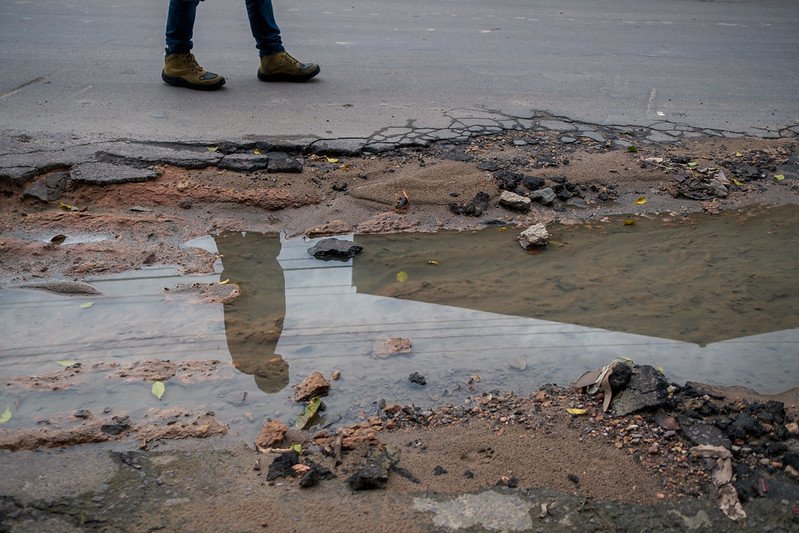 “A gente que faz entrega passa aqui direto e é complicado. São muitos prejuízos no pneu, peças da moto quebram. Já vi muitos carros no prego aqui. Tudo sai do nosso bolso. Quando chove, é pior ainda, porque alaga tudo”, afirmou.