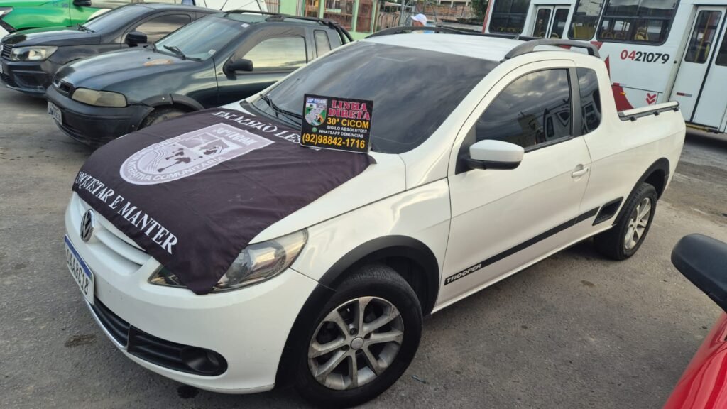 Ele informou que um veículo Volkswagen, modelo Saveiro, de cor branca, teria sido roubado depois de os suspeitos abordarem as vítimas agressivamente.