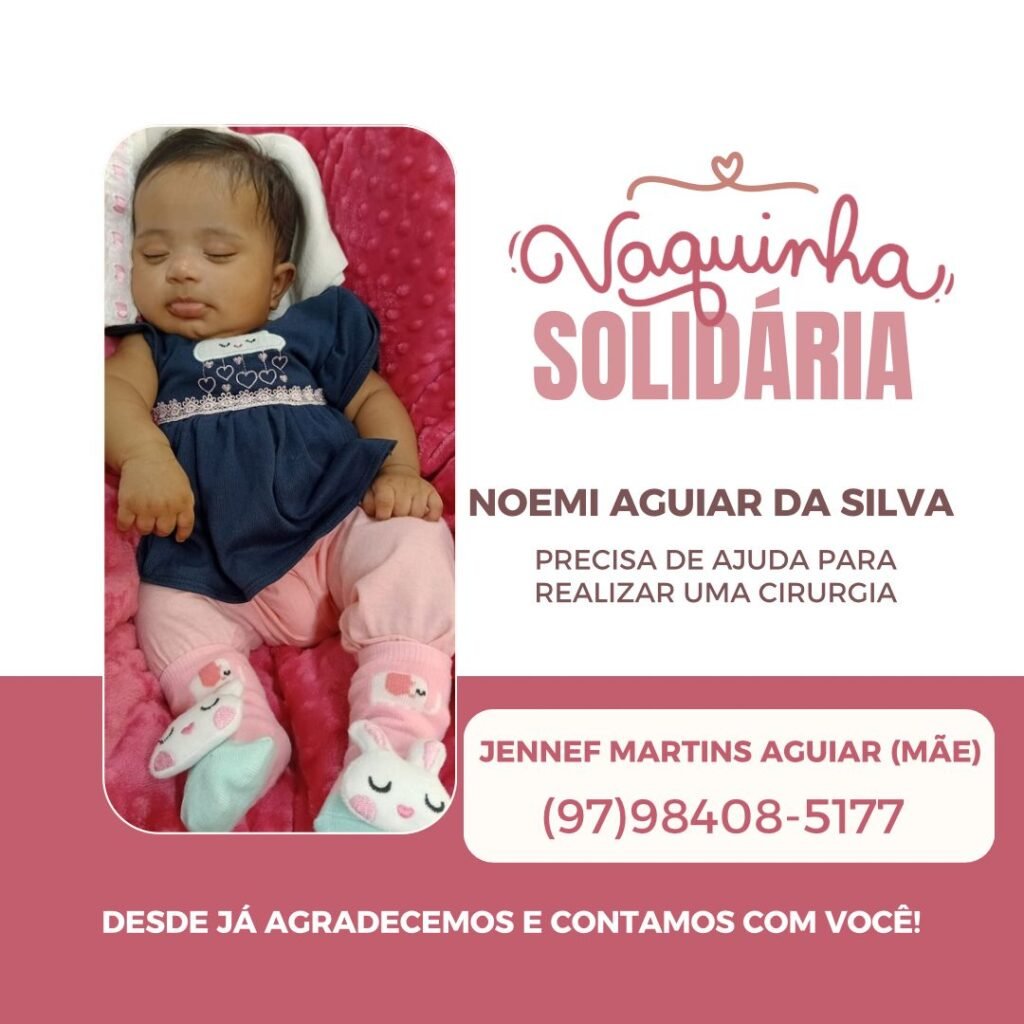 MANAUS (AM) – Familiares e amigos lançaram uma vaquinha solidária para arrecadar recursos destinados à cirurgia da pequena Noemy Aguiar da Silva, de apenas 3 meses. A campanha tem como objetivo sensibilizar a população e ajudar a custear o procedimento médico, estimado em R$ 14.120,00.