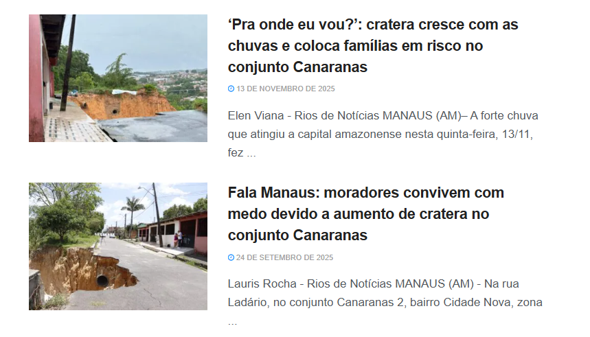 Problemas semelhantes na região são recorrentes e já foram denunciados ao longo de 2025 pelo portal riosdenoticias.com.br. As ocorrências estão relacionadas principalmente a falhas de infraestrutura e riscos à moradia.