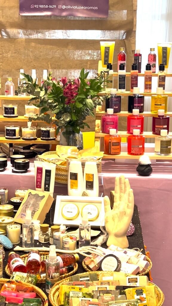 A empreendedora Clara Canté, da Casa da Carol, destaca produtos naturais e aromáticos. “Vendemos incensos, incensários, livros e itens ligados ao bem-estar e ao cuidado pessoal. O incenso mais procurado é o ‘Olíbano em Rosas’, totalmente natural, feito da resina do coco, sem carvão, ideal para quem busca cheiros suaves”.