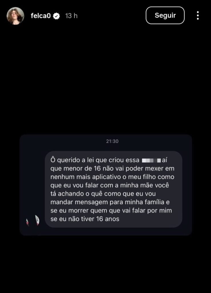 Em uma publicação recente nas redes sociais, Felca expôs um dos comentários recebidos por um usuário que criticava a nova medida “Como é que eu vou falar com a minha mãe? Quem é que vai falar por mim, se eu não tiver 16 anos?”, reclamou.