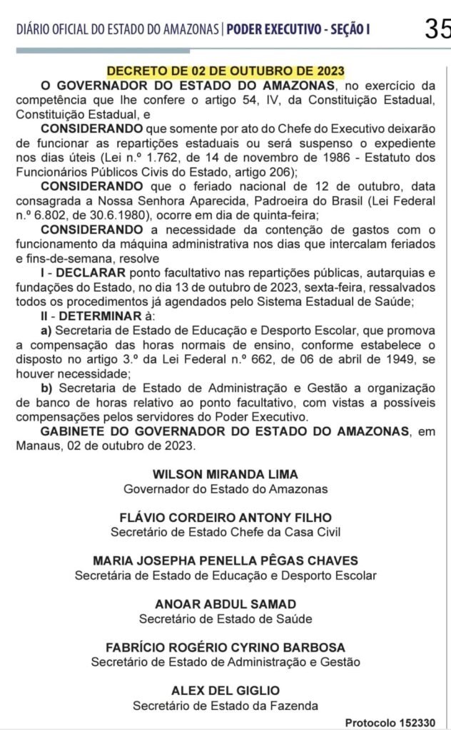 MANAUS (AM) – O Governo do Amazonas determinou, por decreto publicado no dia 2 de outubro, no Diário Oficial, ponto facultativo na próxima sexta-feira, 13/10. A determinação vale para repartições públicas, autarquias e fundações do Estado.