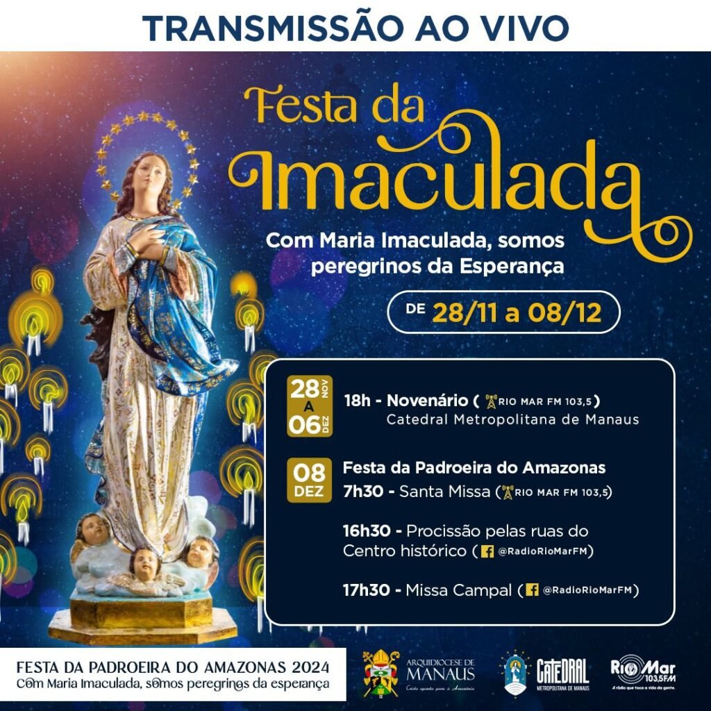 As celebrações do dia da padroeira começam às 7h30, no dia 8, com a Santa Missa na Catedral Metropolitana de Manaus. Às 16h30, uma procissão percorrerá as ruas do Centro Histórico da cidade, seguida, às 17h30, por uma Missa Campal, que será transmitida ao vivo pela Rádio Rio Mar FM.