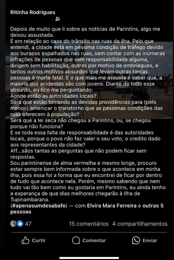 Além disso, Rita Rodrigues, parintinense que mora atualmente no Estado do Rio de Janeiro, expressou sua indignação nas redes sociais em relação ao caos no trânsito das ruas do município. Em sua página no Facebook, ela compartilhou sua surpresa ao tomar conhecimento das condições enfrentadas pela Ilha Tupinambarana.