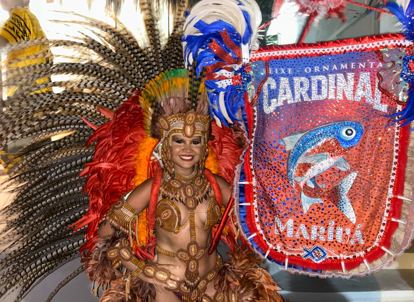 A porta-estandarte carrega o símbolo maior da agremiação. Representa orgulho, identidade e tradição. Durante a apresentação, o item é avaliado pela elegância, força cênica, desenvoltura e respeito ao pavilhão que conduz. No Acará-Disco, Rafaela Moreira, no Cardinal, Jaíne Bastos.