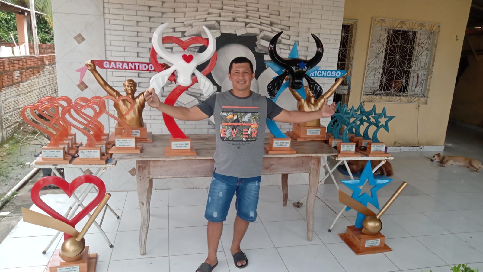 Os troféus principais, dos bois, levam o símbolo de cada boi estilizado, o coração, do Garantido, e a estrela, do Caprichoso, nas suas respectivas cores, o vermelho e o azul, além da cabeça dos bois. “Como a gente está falando em amor e orgulho, então a gente tem que ter orgulho dos nossos símbolos, das nossas cores”, defende o criador das obras.