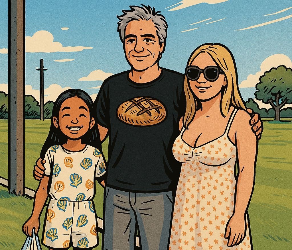 “Minha filha mais velha, essa loirinha da imagem fez este processo digital [que está em febre alta nas redes sociais] com a minha filha caçula. A imagem de um piquenique em família feito no sítio, na BR-174, nas minhas férias das charges. Não sei se sou contra isso. Nós que dominamos esta arte, a do desenho, podemos dizer que ficamos sim preocupados com a IA”, explicou o artista.