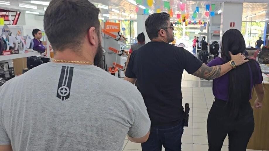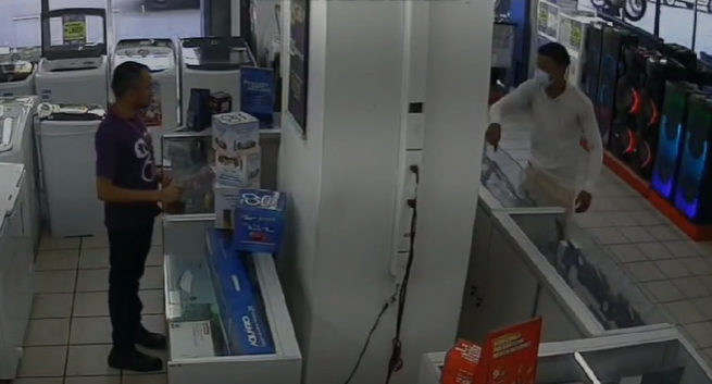 A ação criminosa foi registrada pelas câmeras de vigilância da loja de eletrodomésticos, e mostra o exato momento em que dois suspeitos entram no estabelecimento, abordam dois funcionários e começam a furtar os produtos das prateleiras da loja.