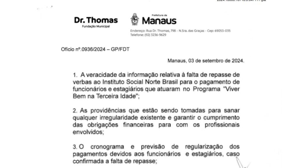 MANAUS (AM) – Funcionários do Instituto Social Norte Brasil, empresa terceirizada que presta serviços para a Fundação Dr. Thomas, denunciam a Prefeitura de Manaus por atrasos salariais por não repasse de verbas. De acordo com eles, os pagamentos estão atrasados há seis meses.