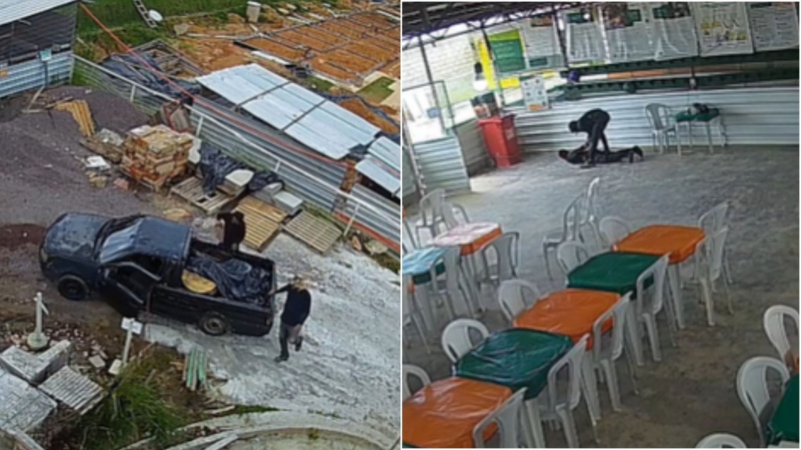 De acordo com as imagens, o crime ocorreu por volta das 13h, quando dois homens invadiram o local e começaram a roubar fiação elétrica e outros materiais. Um dos suspeitos estava armado e rendeu um dos trabalhadores, mantendo-o como refém durante o assalto.