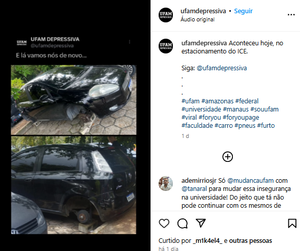 “Tem que mudar essa insegurança na universidade! Do jeito que está, não pode continuar com os mesmos de sempre“, afirmou um usuária. Outros usuários também compartilharam suas experiências, como: “Uma vez, roubaram o velocímetro do meu carro na USP. A seguradora, a corretora, a concessionária, a polícia acharam absurdo. A segurança do campus disse que isso era normal” e “Ufam sendo Ufam.”