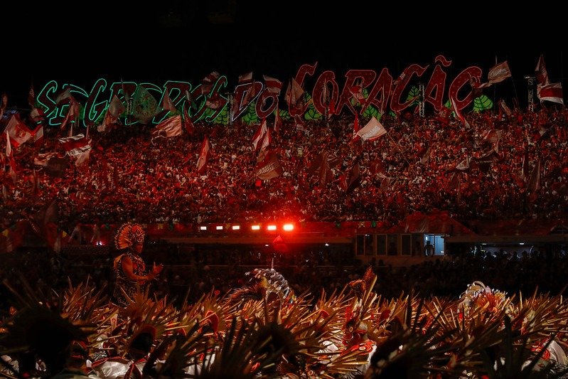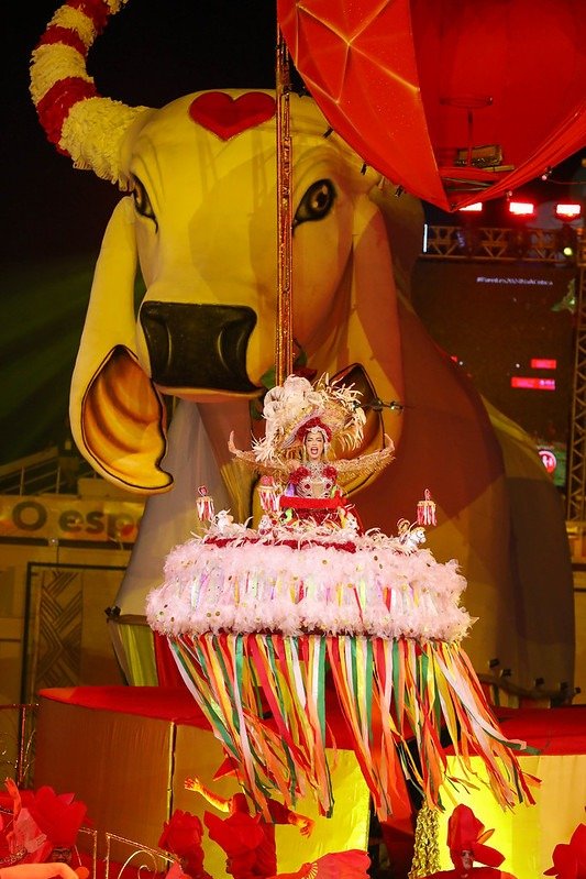 Outro esperado momento foi a aparição da sinhazinha do Boi Garantido, que surgiu de dentro de uma alegoria representando o coração, símbolo do bumbá vermelho e branco. Valentina Coimbra, representante do item 7 do Festival de Parintins, falou sobre a preparação para este ano.