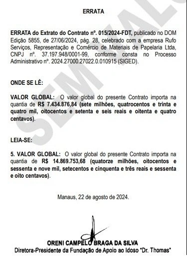 A alteração no contrato foi publicada novamente como errata, aumentando o valor dos serviços para R$14,9 milhões – (Foto: Divulgação/ DOM Manaus)