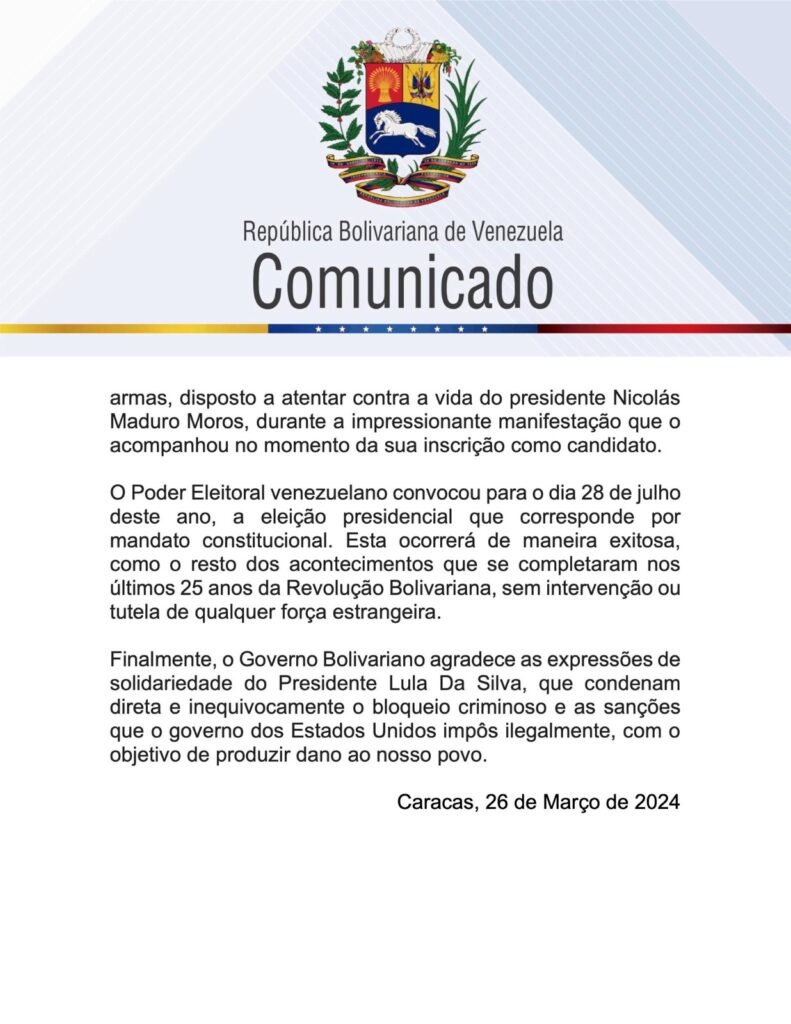 MANAUS (AM) – Os ânimos parecem ter mudado entre Brasil e Venezuela nesta terça-feira, 26/3, com a resposta do governo Maduro rebatendo o comunicado do Itamaraty publicado mais cedo, em que diz: “O governo brasileiro acompanha com expectativa e preocupação o desenrolar do processo eleitoral naquele país [Venezuela]”, assim completou o primeiro trecho.