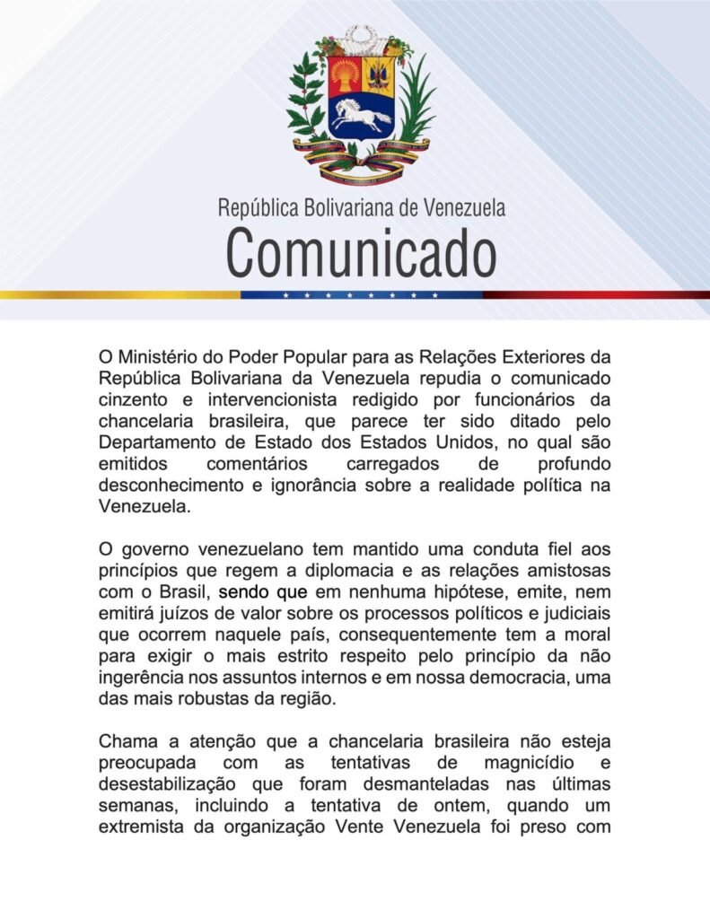 Em resposta ao governo brasileiro, o ministério de Relações Exteriores da Venezuela repudiou o que chamou de “comunicado cinzento e intervencionista, regido por funcionários da chancelaria brasileira“, onde ainda relaciona “ignorância” por parte do Brasil, às eleições venezuelanas.