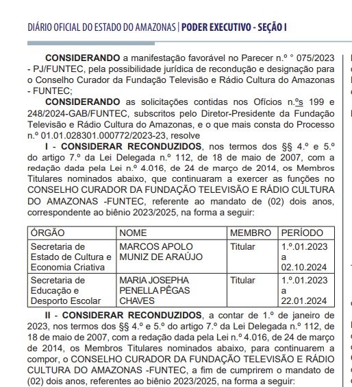 Trata-se de uma formalização administrativa relativa ao período em que o ex-secretário de Cultura e Economia Criativa, Marcos Apolo Muniz, esteve como membro titular do Conselho Curador da Funtec, o que ocorreu entre 1º de janeiro de 2023 e 2 de outubro de 2024. Desde então, a titularidade está com o secretário de Cultura e Economia Criativa, Cândido Jeremias Neto”