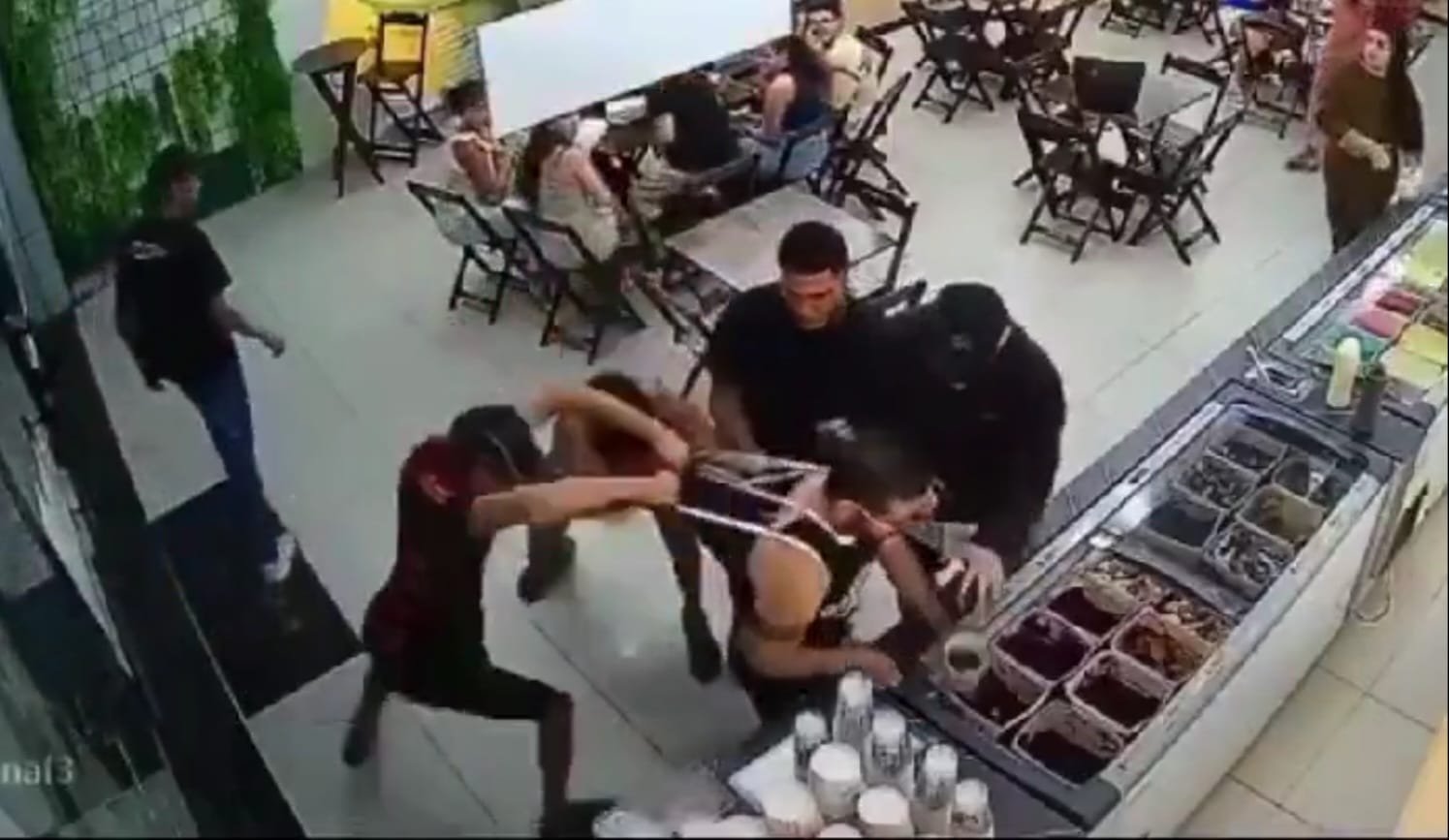 No vídeo, a vítima aparece em pé, no balcão, escolhendo sorvetes, quando é cercada pelos agressores. Em seguida, o grupo parte para cima do homem, o empurra e arranca a camisa à força.