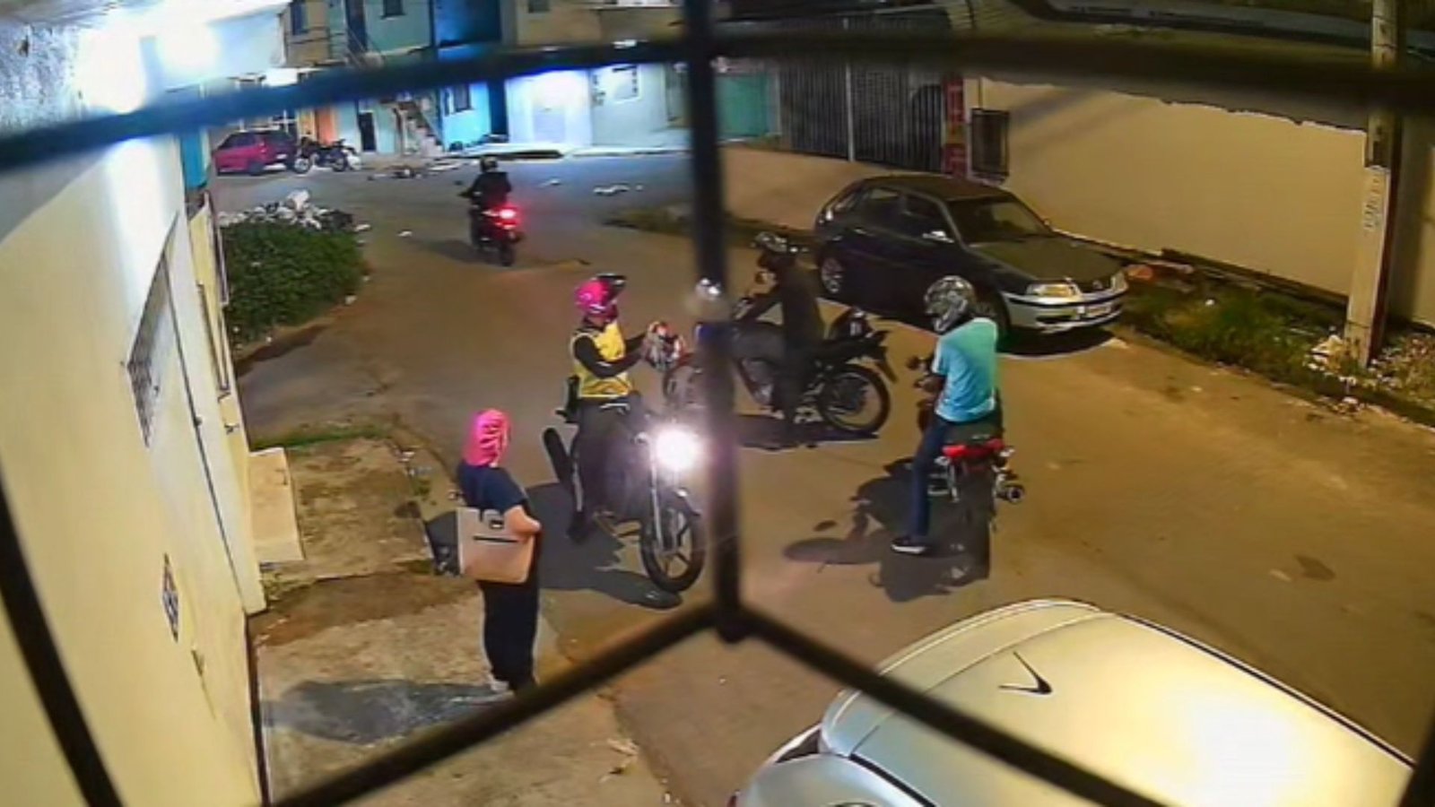 De acordo com as imagens, é possível ver o momento em que uma mulher chega em frente a uma residência, por volta das 21h31, acompanhada por um motociclista de aplicativo. Assim que ela desce da garupa, ambos são abordados por três homens em motocicletas.