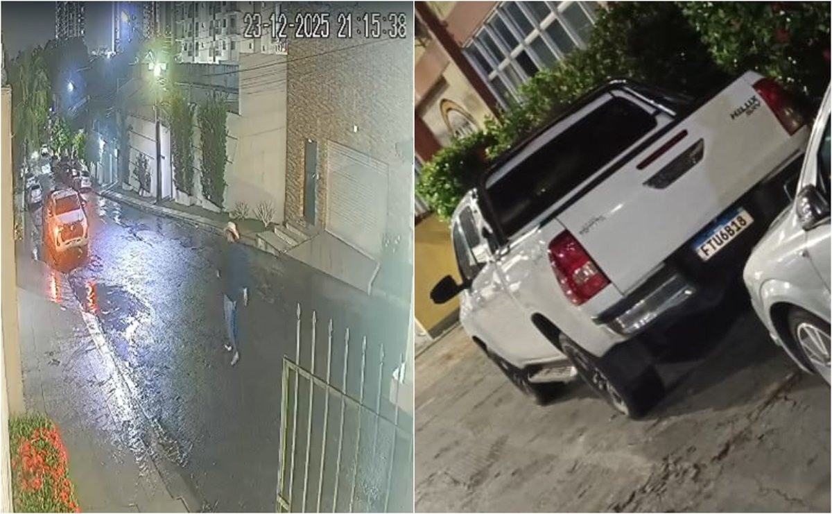 As imagens mostram um homem usando chapéu, blusa preta de manga comprida, calça jeans e tênis caminhando pela rua até se aproximar do veículo. Em seguida, ele entra na caminhonete, aguarda a passagem de um carro de passeio e foge do local em alta velocidade.