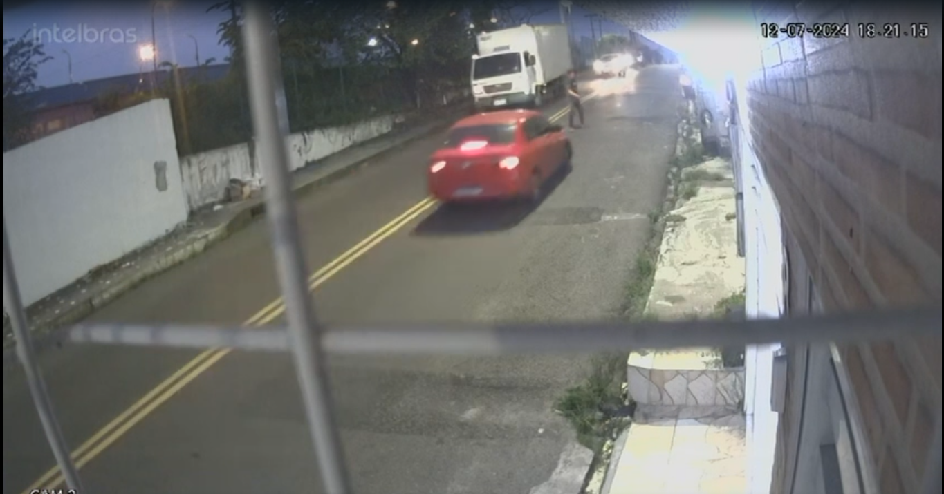 A vítima aparece atravessando em frente a um caminhão que vinha de um lado da via. No entanto, ao tentar passar para o lado oposta da pista, é atingido por um carro vermelho.