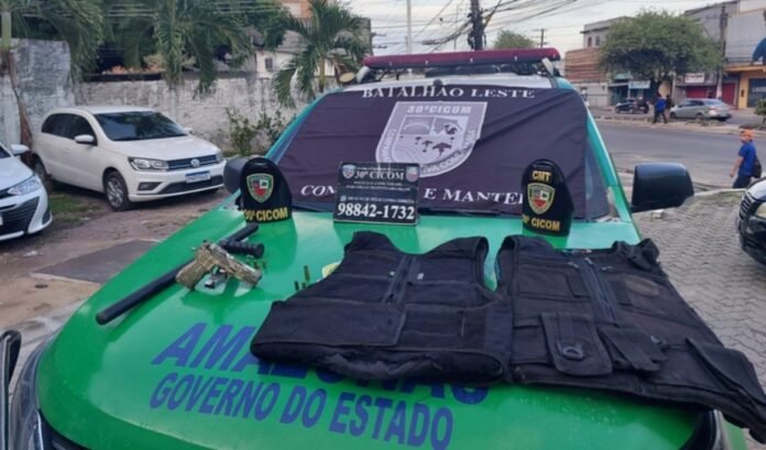 Conforme a polícia, o homem estava com uma pistola 380 com carregador, várias munições, dois coletes a prova de balas, um bastão policial e munições, que foram apreendidos.