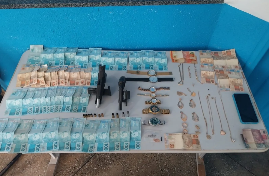 Com eles, a polícia apreendeu uma pistola calibre 380 e um revólver calibre 38, além de R$ 4.398 em espécie e vários objetos roubados da casa da vítima, como relógios, anéis, colares e um celular.