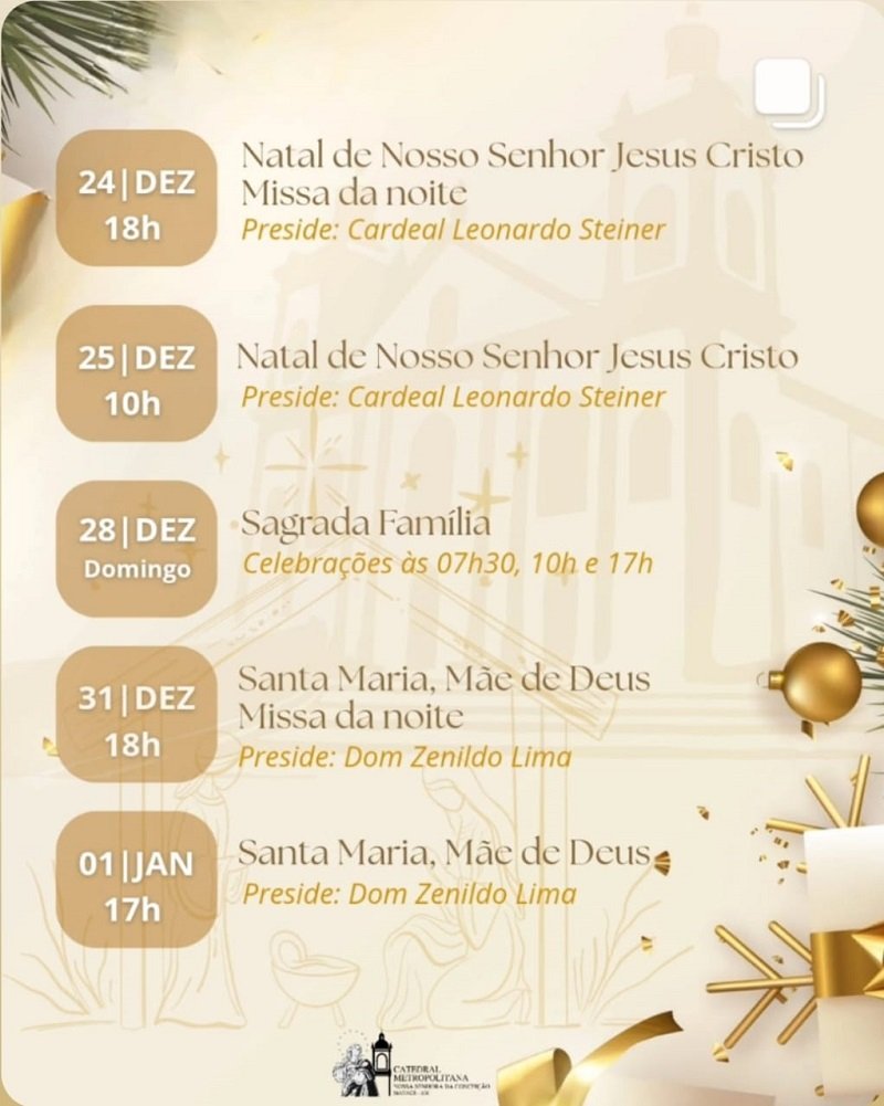 Na Arquidiocese de Manaus, o Natal é celebrado com uma ampla programação em diversos horários, envolvendo mais de 900 comunidades espalhadas pela região metropolitana. Na Catedral Metropolitana de Manaus, a Missa da Vigília será celebrada no dia 24/12, às 18h, enquanto a Missa do Natal, no dia 25/12, acontece às 10h. Ambas serão presididas pelo arcebispo metropolitano, cardeal Leonardo Ulrich Steiner.