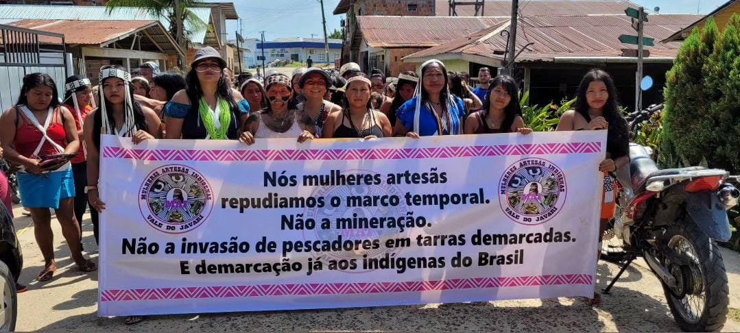 “A manifestação no Vale do Javari segue em sincronia com a orientação política de nossas representações @apiboficial @univajaoficial e @coiabamazonia . Os parentes pedem a derrubada do Marco Tempo pautado no @supremotribunalfederal e no @senadofederal”, afirmou Eliesio Marubo, procurador jurídico da Univaja.