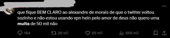 Quem consegue acessar a rede relata lentidão na hora de postar mídias e entrar em links. Alguns internautas comemoraram o acesso ao X, mas têm receio de serem multados pelo acesso ‘proibido’.