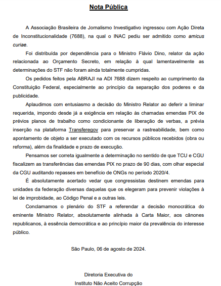 “Pensamos ser correta igualmente a determinação no sentido de que o Tribunal de Contas da União (TCU) e Controladoria-Geral da União (CGU) fiscalizem as transferências das emendas PIX no prazo de 90 dias, com olhar especial da CGU auditando repasses em benefício de ONGs no período 2020/4”, diz a nota do INAC