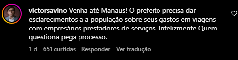 “Venha até Manaus! O prefeito precisa dar esclarecimentos a a população sobre seus gastos em viagens com empresários prestadores de serviços. Infelizmente quem questiona pega processo”, declarou um terceiro.