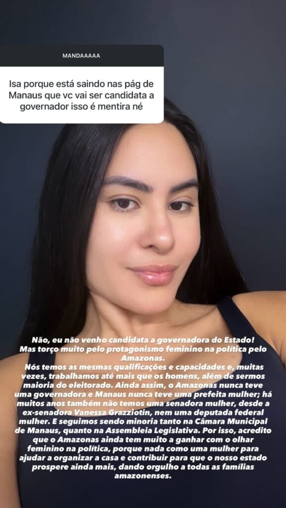 A declaração de Isabelle surgiu após rumores nas redes sociais sobre uma articulação para que a cunhã-poranga do Garantido se filiasse ao MDB e disputasse uma vaga de deputada federal nas eleições de 2026. A informação foi desmentida pela própria influenciadora.