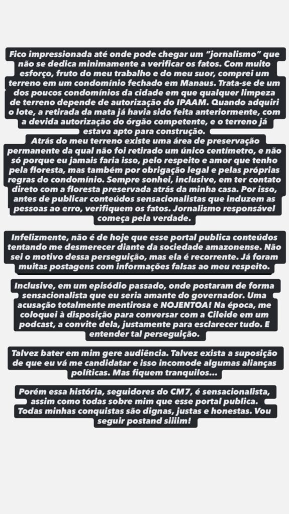 “Publicar conteúdos sensacionalistas que induzem as pessoas ao erro. Verifiquem os fatos. Jornalismo responsável começa pela verdade. Infelizmente, não é de hoje que esse portal publica conteúdos tentando me desmerecer diante da sociedade amazonense. Não sei o motivo dessa perseguição, mas ela é recorrente. Já foram muitas postagens com informações falsas ao meu respeito”, disse Isabelle.