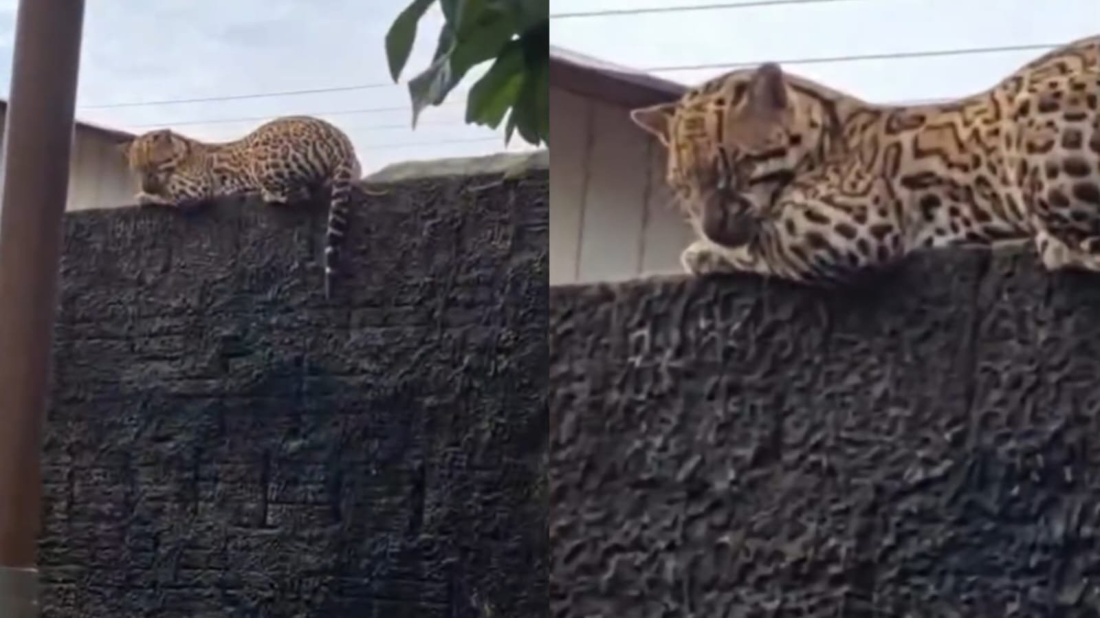 Nas imagens, a jaguatirica aparece deitada sobre o muro, aparentemente calma, com os olhos fechados, sem demonstrar sinais de agressividade ou estresse.