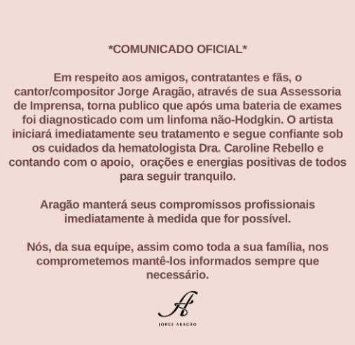 A doença foi identificada após Jorge Aragão realizar uma série de exames. De acordo com a nota publicada em seu perfil no Instagram, o artista foi diagnosticado com um linfoma não-hodgkin.