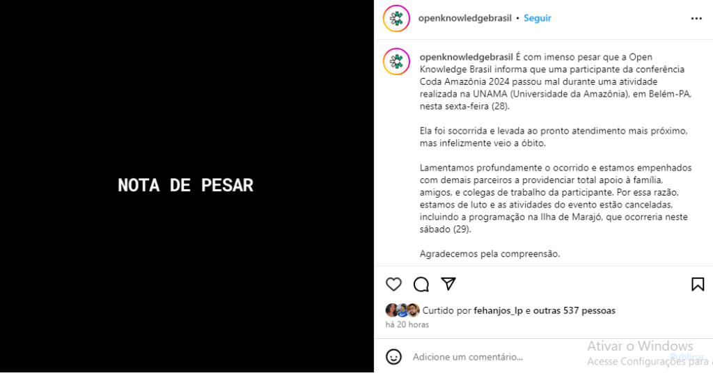 A Organização sem fins lucrativos voltada à promoção da informação e da transparência, lamentou profundamente o ocorrido e providenciou apoio à família, amigos, e colegas de trabalho da participante. A programação na Ilha de Marajó, que ocorreria neste sábado, 29/6, foi cancelada segundo a nota.