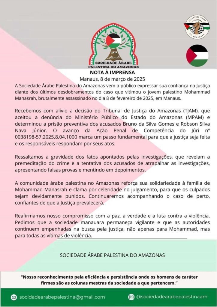 Por meio de nota, a Sociedade Árabe Palestina do Amazonas destacou a confiança na Justiça do Amazonas e alívio com a decisão do tribunal de justiça em aceitar a denúncia do Ministério Público do Estado (MPAM). “O avanço da Ação Penal marca um passo fundamental para que a justiça seja feita e os responsáveis respondam por seus atos“, frisou o comunicado.