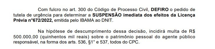 Conforme consta na decisão, em caso de descumprimento, o Departamento Nacional de Infraestrutura de Transportes (Dnit) poderá enfrentar uma multa de R$ 500 mil. De acordo com a juíza, é necessário uma governança ambiental robusta e controle do desmatamento antes de prosseguir com a obra.