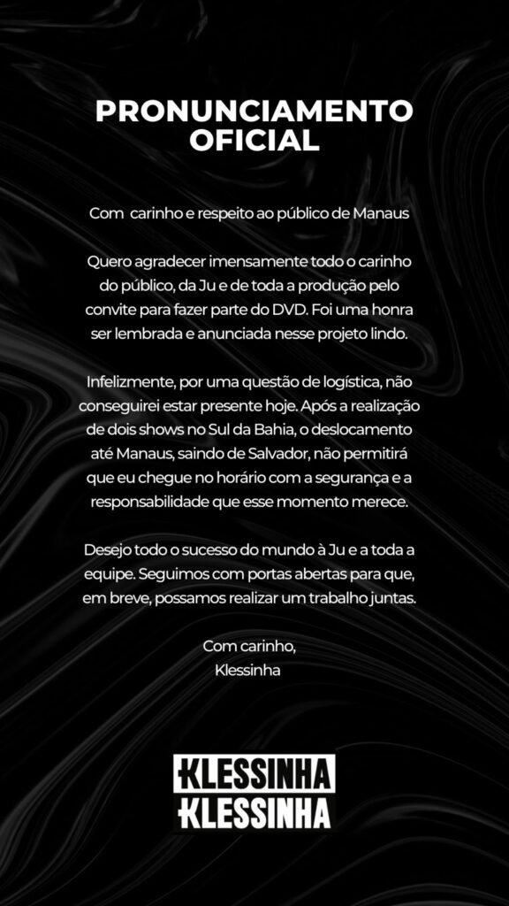 De acordo com a artista, a ausência ocorreu por dificuldades logísticas. Mesmo após tentar alternativas, incluindo a possibilidade de um voo particular, não foi possível chegar à capital amazonense a tempo do evento. Segundo Klessinha, o custo da aeronave particular chegou a R$ 300 mil, e não havia mais voos comerciais compatíveis com o horário da apresentação.