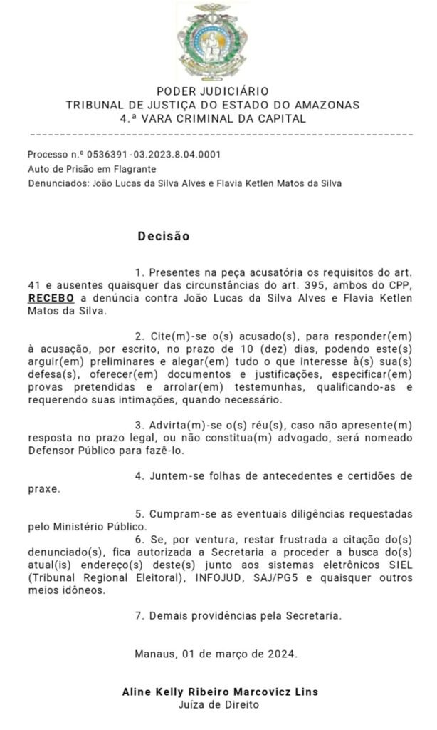 A Justiça do Amazonas, na última quinta-feira, 1º/3, considerou o pedido do órgão para tornar Picolé e Flávia réus, no entanto, foi concedido um prazo de dez dias para manifestação da defesa. A decisão foi assinada pela juíza de Direito Aline Kelly Ribeiro Marcovicz Lins, da 4ª Vara Criminal de Manaus.
