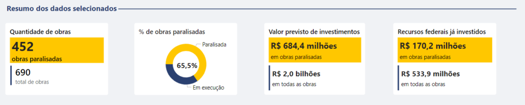 Em 2024, o TCU identificou 452 obras paralisadas no estado, representando 65,5% das contratações vigentes. Isso significa que, a cada três empreendimentos contratados, dois estão parados.